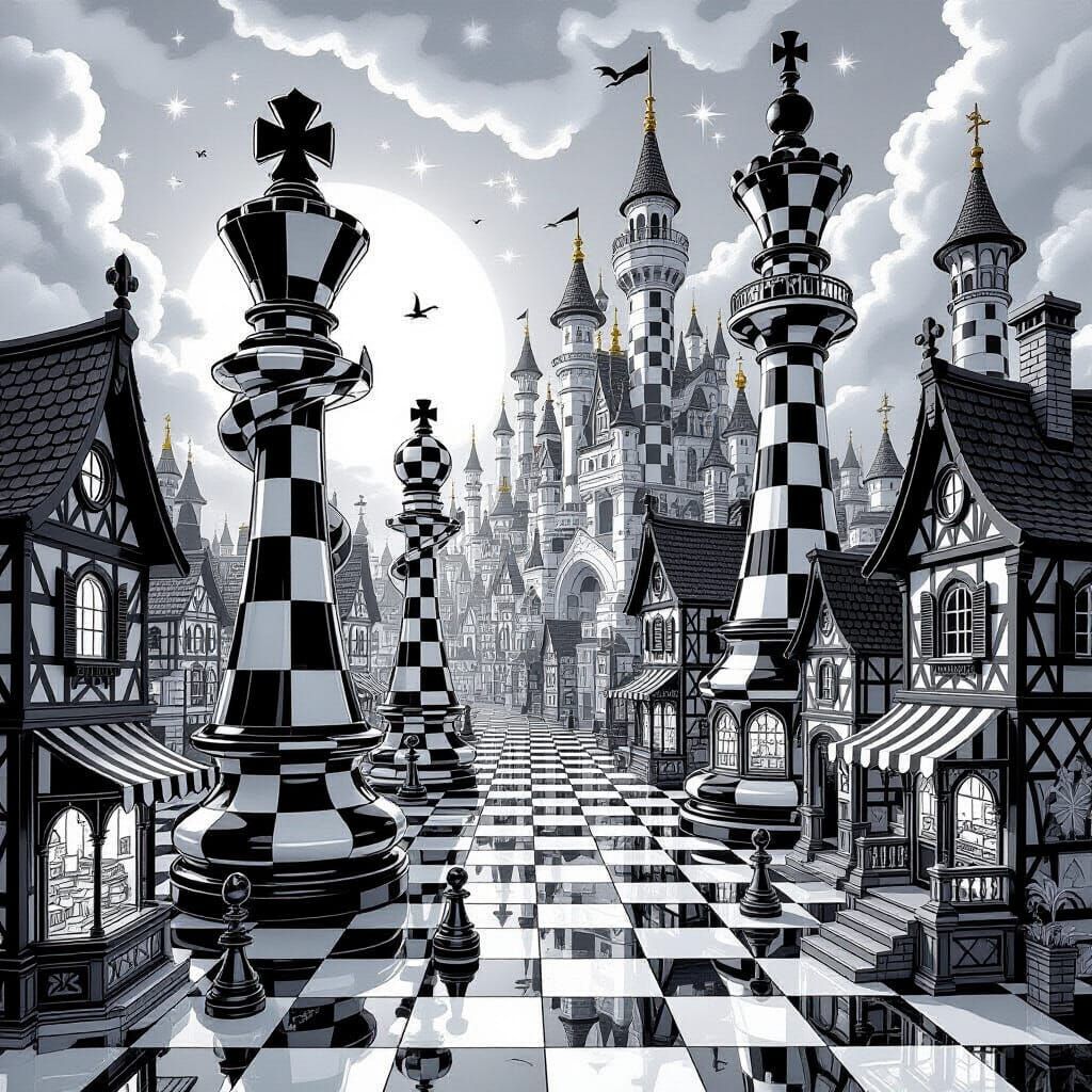 : Imagine a whimsical village, entirely constructed in the shape of chess pieces, where each building reflects the character of its corresponding figure. Envision towering knights with spiral staircases, elegant rooks that resemble grand castles, and quaint pawns that serve as cozy shops. The atmosphere ...