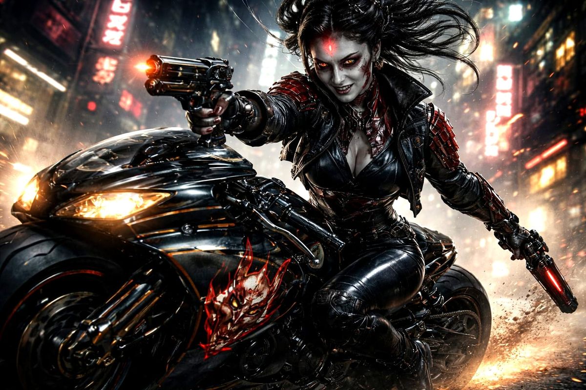 This striking image depicts a formidable Japanese woman in a cyberpunk style, blending Geisha and samurai elements with cybernetic enhancements. A futuristic motorcycle with red neon lighting speeds through a dark, neon-lit Tokyo street.
