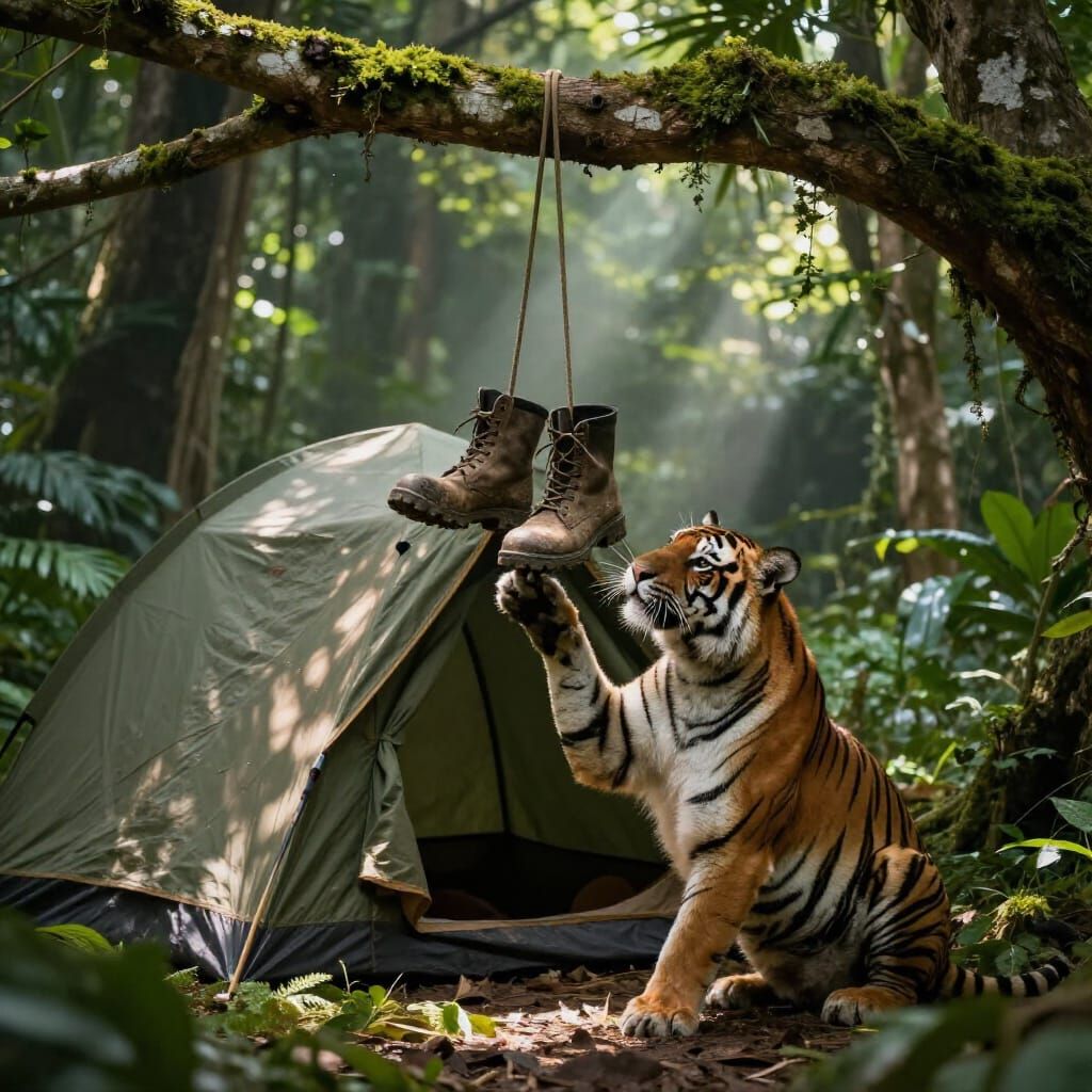 This photorealistic image depicts a tiger playing with military boots hanging from a branch near a jungle tent. Dramatic lighting and cinematic realism create a captivating scene.