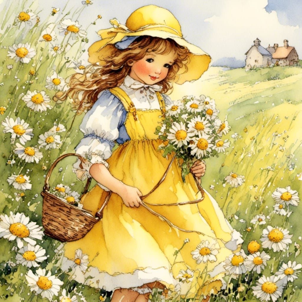 This image shows a girl in a yellow dress and bonnet, reminiscent of Holly Hobbie's style, standing in a wildflower field. She holds a bouquet of white daisies in this charming, rustic scene.