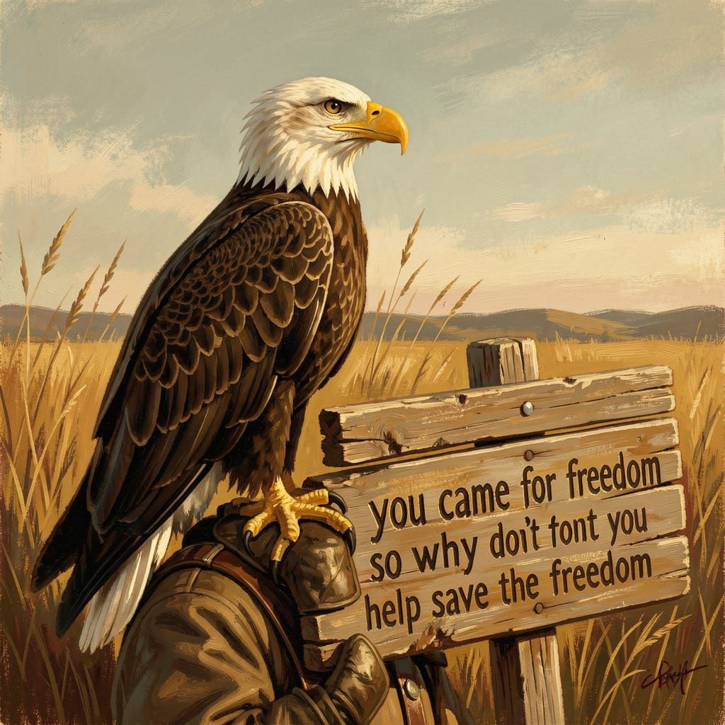 This image features a bald eagle on a soldier's shoulder, with dead grass and a sign about freedom. Rendered in a dramatic, painterly style reminiscent of American Western art.