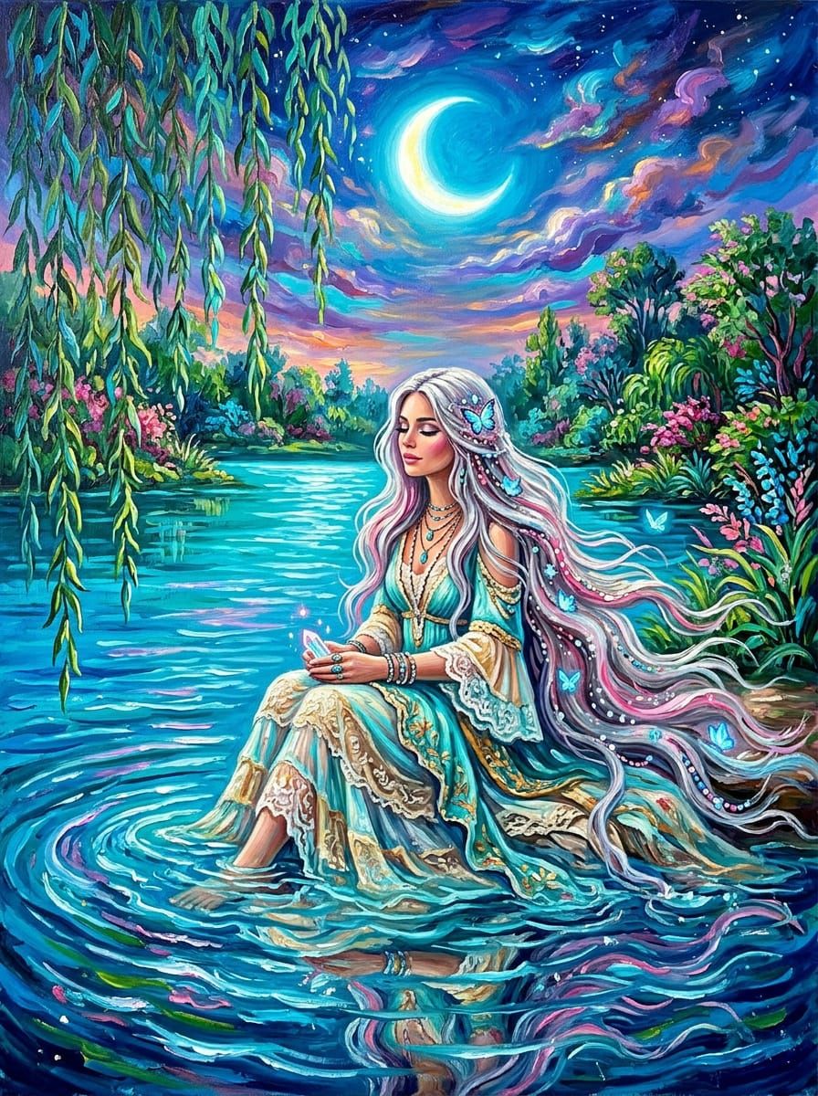 A mystical boho woman with silver and pink hair sits in rippling azure water, adorned with glowing blue butterflies. Ethereal lighting and lush greenery create a magical scene, rendered as an expressive oil painting with impasto textures.
