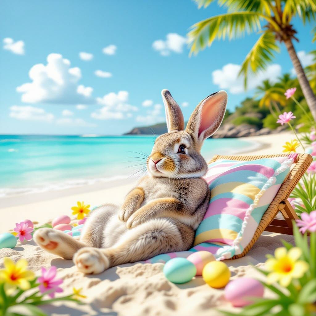 This image shows the Easter Bunny taking a break on a serene beach. The scenery features soft, pastel colors, creating a tranquil and whimsical atmosphere.