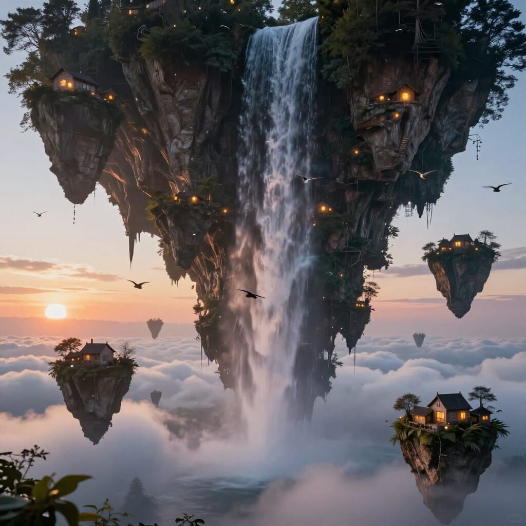 This image shows massive floating islands with waterfalls, glowing houses, and birds during a sunset. It features a fantasy realism style with cinematic composition and detailed volumetric lighting.