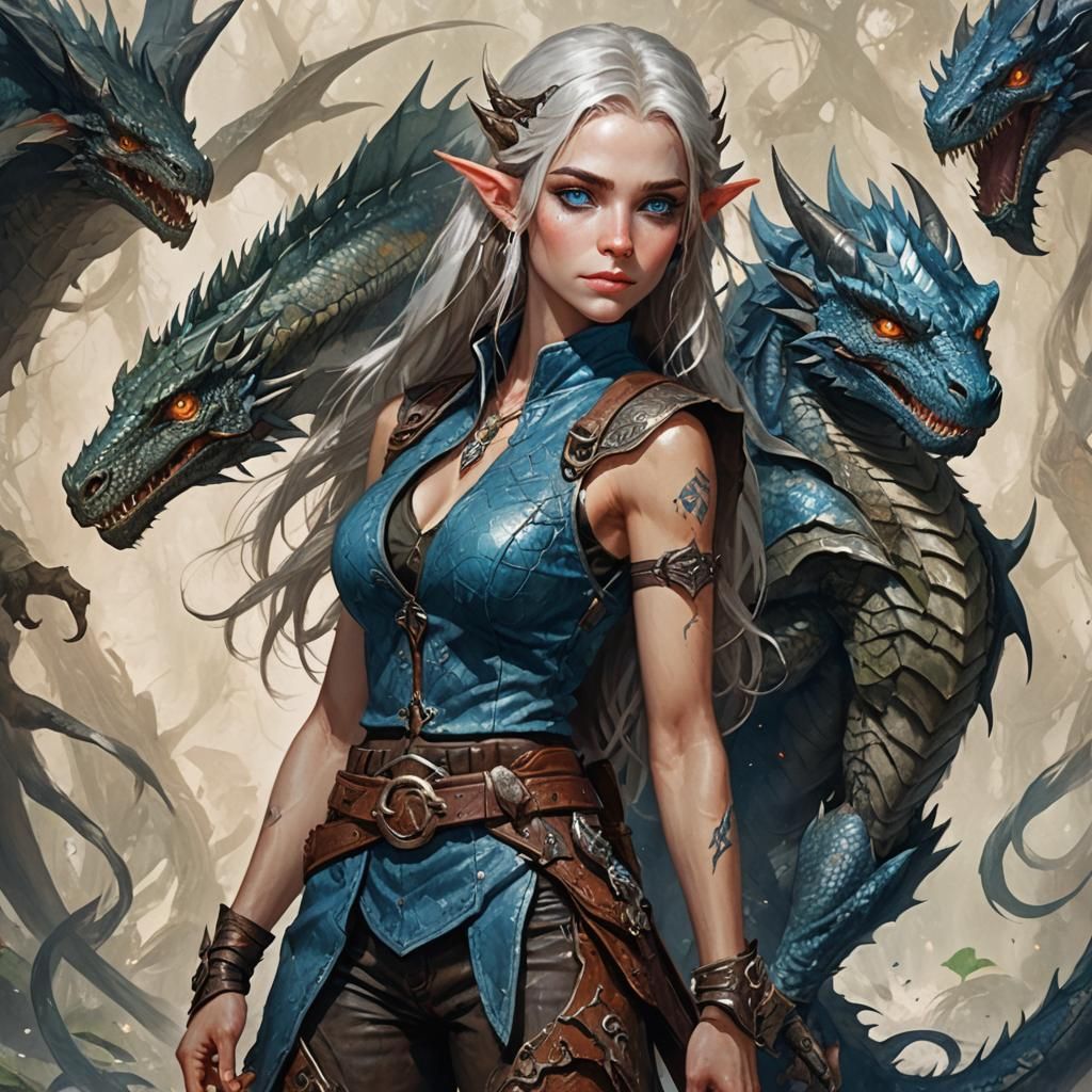 A striking picture of a blue-eyed elf with a draconic companion. The elf wears mottled leather, creating a fantasy-themed composition.