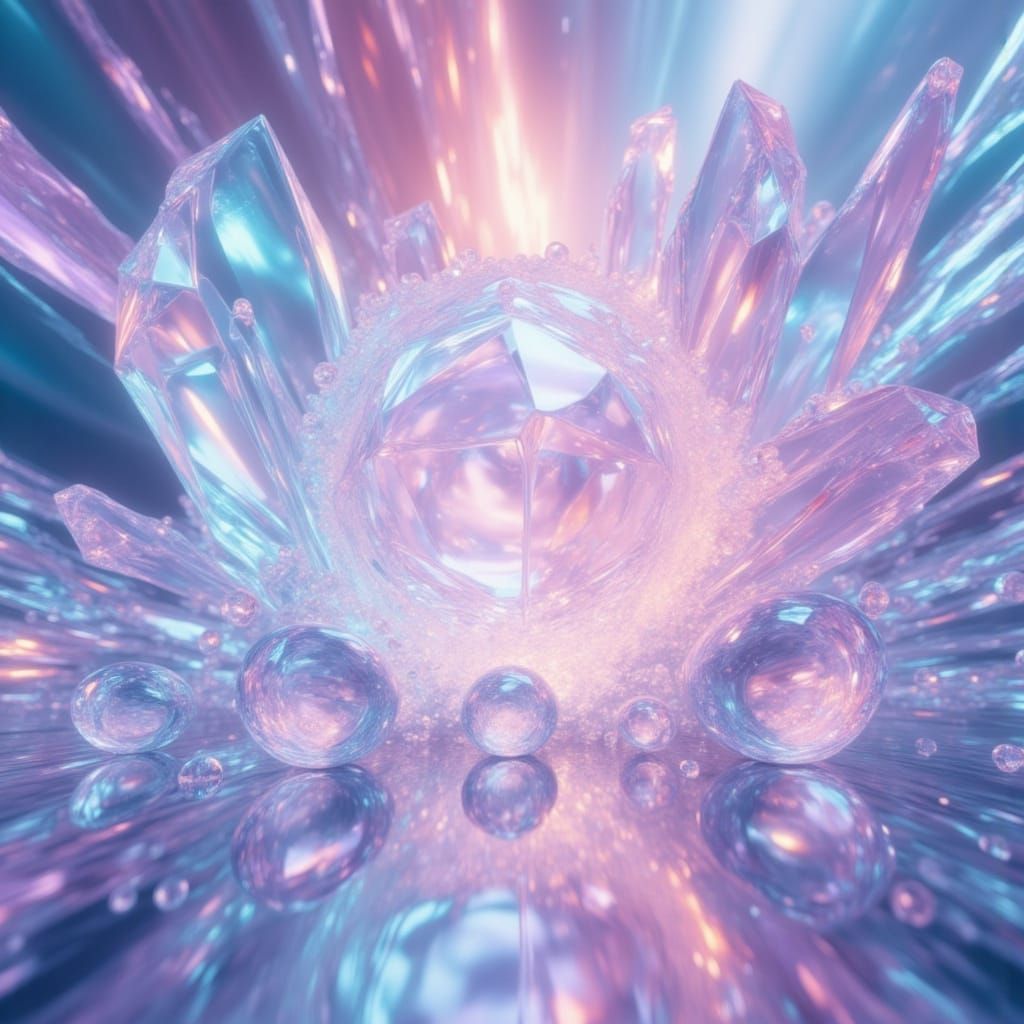 This abstract artwork features sharp geometric diamond shapes refracting light and colliding with soft, glowing pearl-like orbs in an ethereal atmosphere. Features iridescent pastels and high contrast.