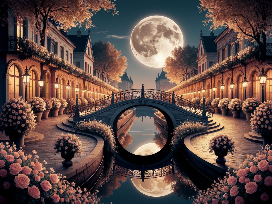 This image depicts a tranquil, moonlit canal in an old-world city. Winding paths, blooming flowers, and vintage buildings create a cozy, nostalgic atmosphere, reminiscent of impressionist art.