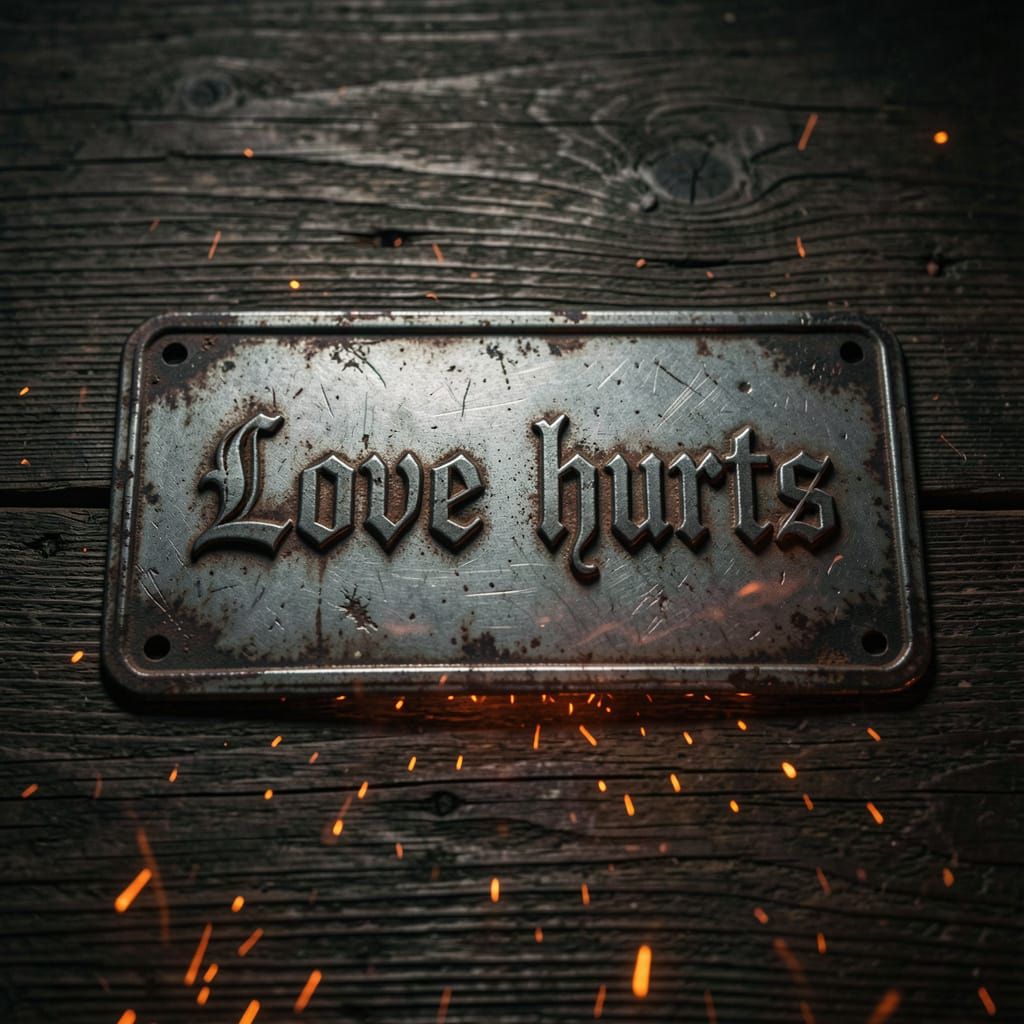This image shows a metal license plate with 'Love Hurts' in gothic letters on dark wood. Faint embers glow beneath, creating a dramatic cinematic atmosphere with textural realism.