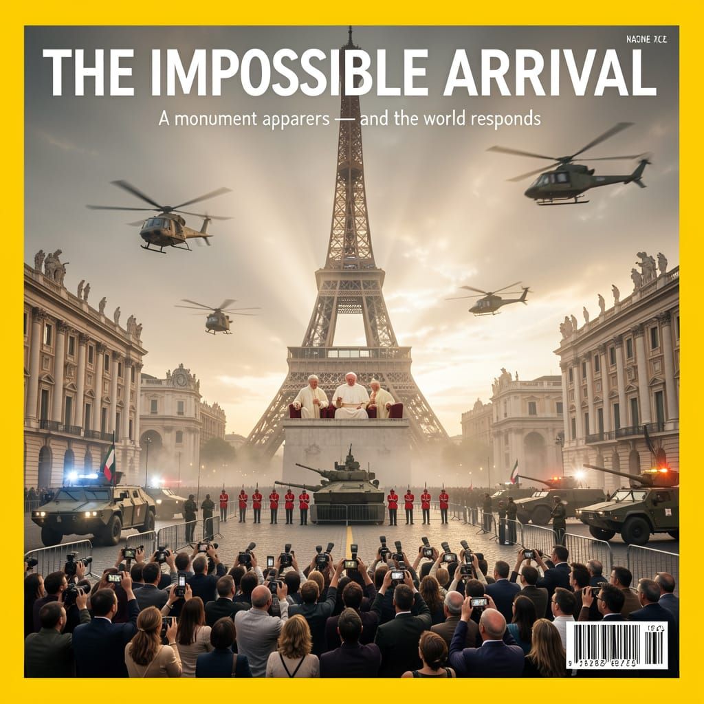 This hyperrealistic image depicts the Eiffel Tower in St. Peter's Square, Rome, with Italian military and a shocked crowd reacting. Photographed in a National Geographic style with dramatic lighting.