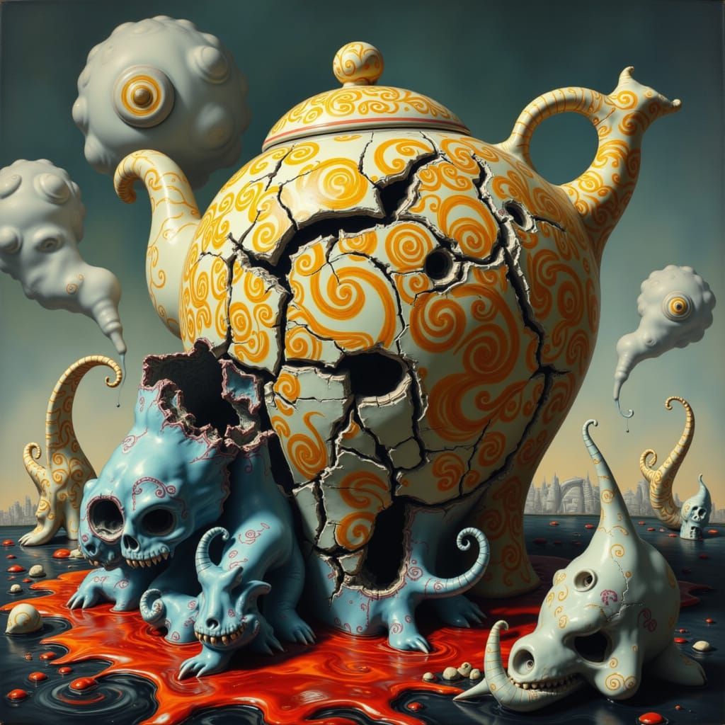 This surreal oil painting showcases a giant, gold-filigreed teapot serving as a home, balanced on a colossal turning gear. Volumetric lighting illuminates gentle steam in a dreamlike, vibrant setting.