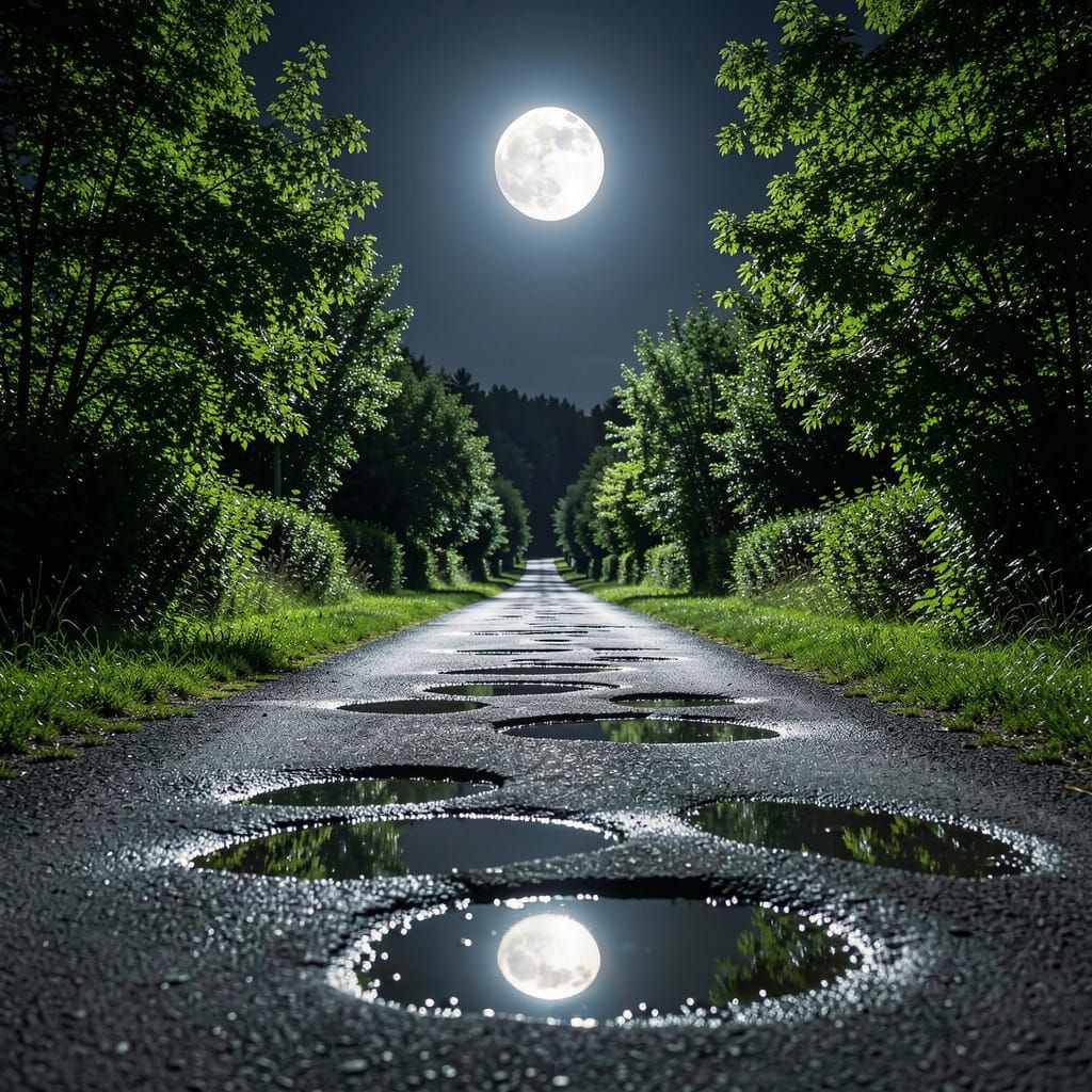 A photorealistic image of a long street vanishing into the horizon under a full moon. Potholes glow intensely, and moonlight shimmers on wet foliage, creating dramatic ambient lighting.