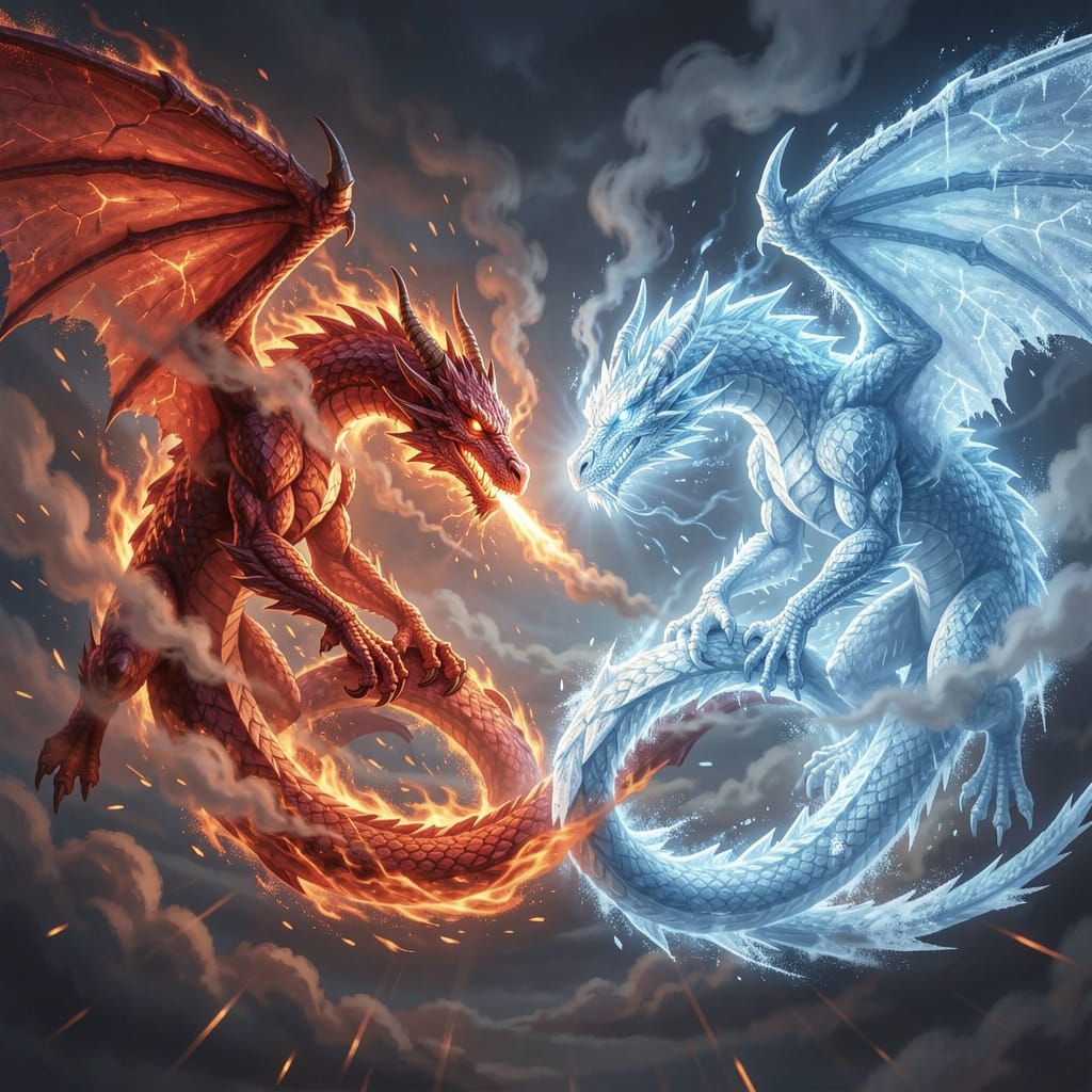 A majestic fire dragon and an ethereal ice dragon soar through a turbulent sky, their tails forming a heart. Epic concept art with dramatic lighting and intricate detail.