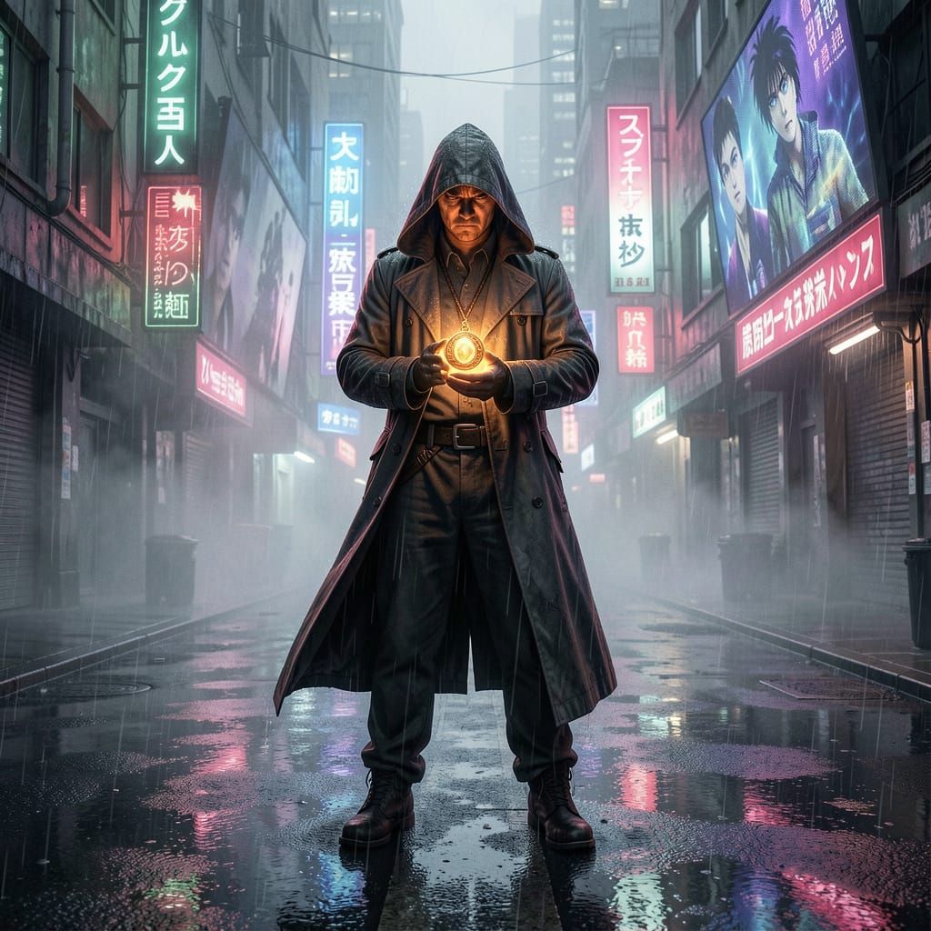 This image shows a wizard in a trench coat on a wet, neon street corner in a futuristic city. Mist and flickering ads fill the background, with dramatic lighting and deep shadows.