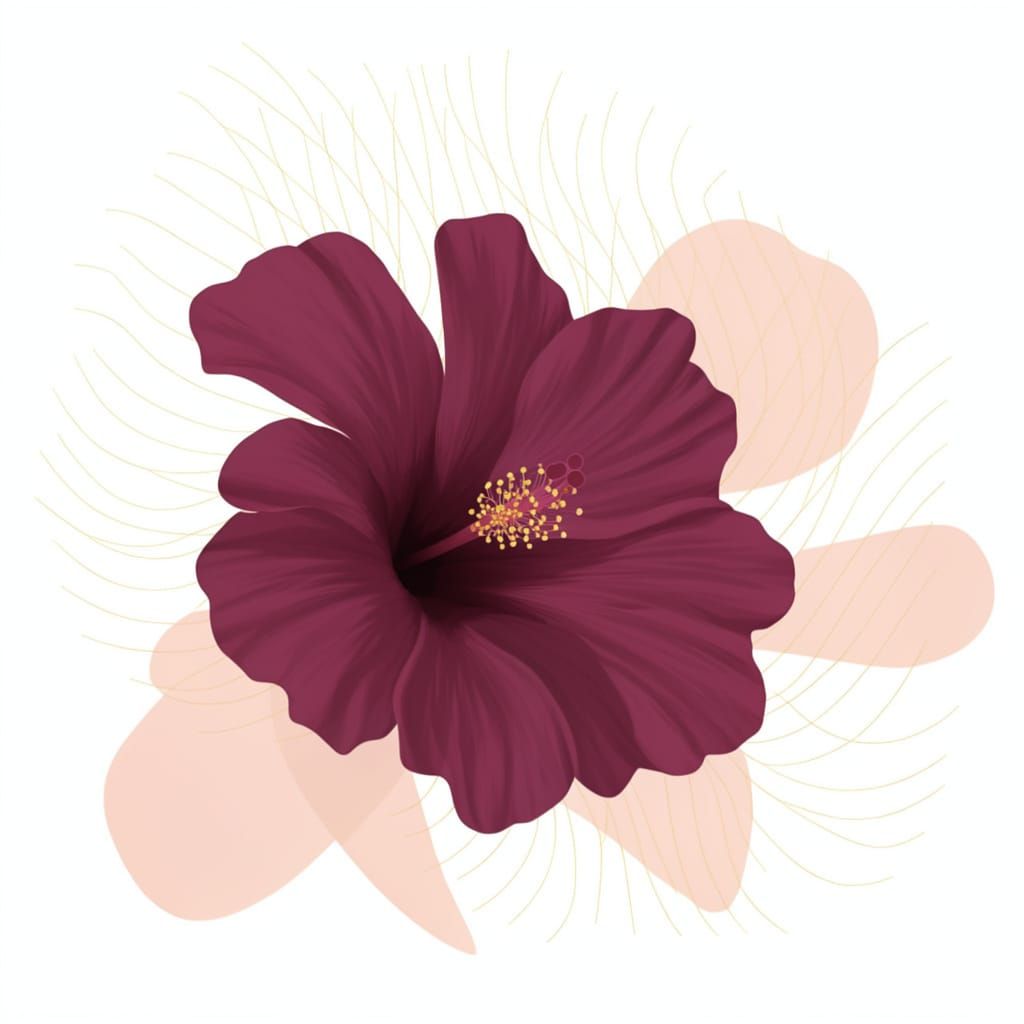 This image features a large, dark pink hibiscus flower with delicate gold accents. It is set against a minimalist background of soft, abstract shapes in muted pink and peach, with subtle gold lines.