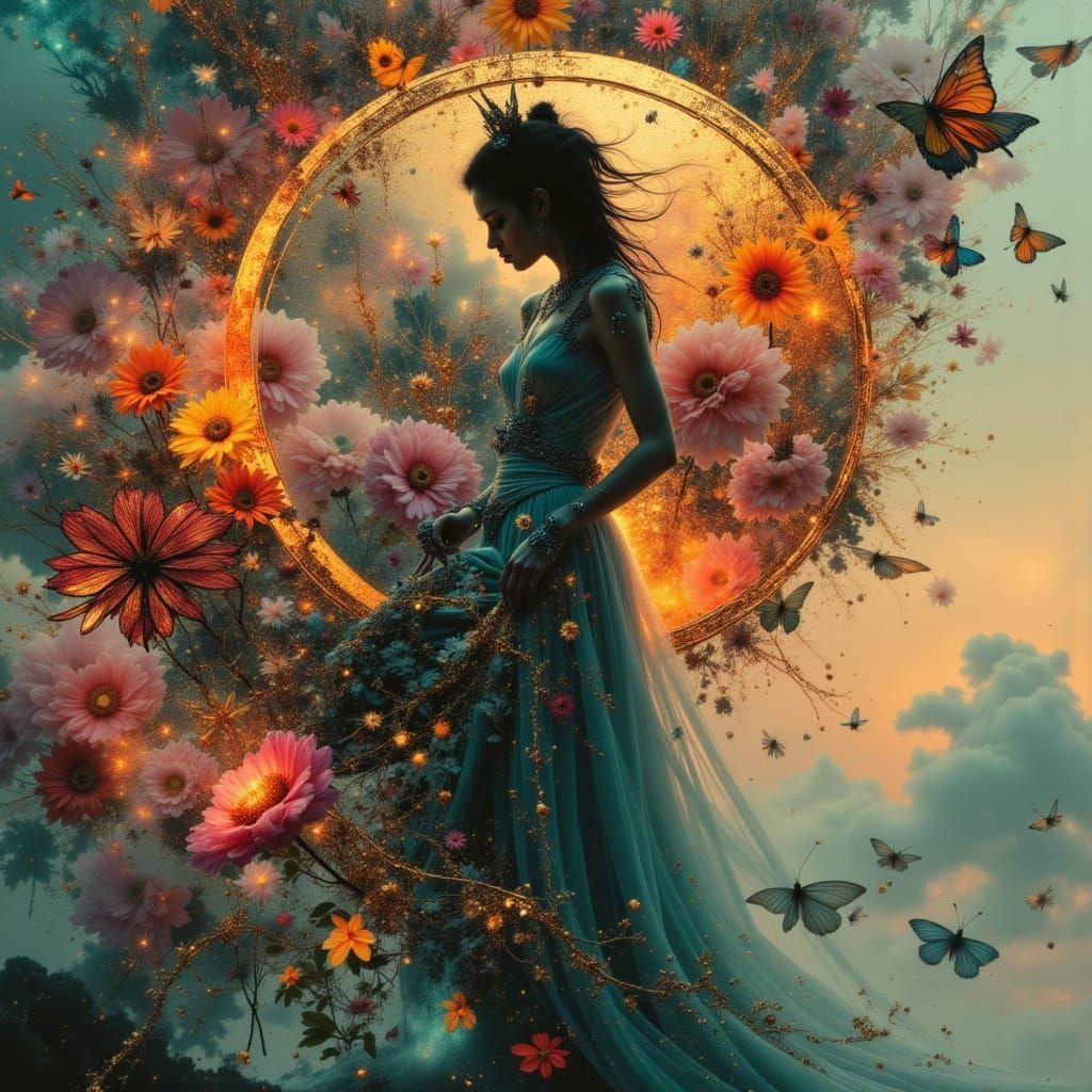This image shows a mystical empress disintegrating into a vibrant Kintsugi symphony, with gold accents and dreamcore aesthetics. Rendered with volumetric lighting and intricate contrast.