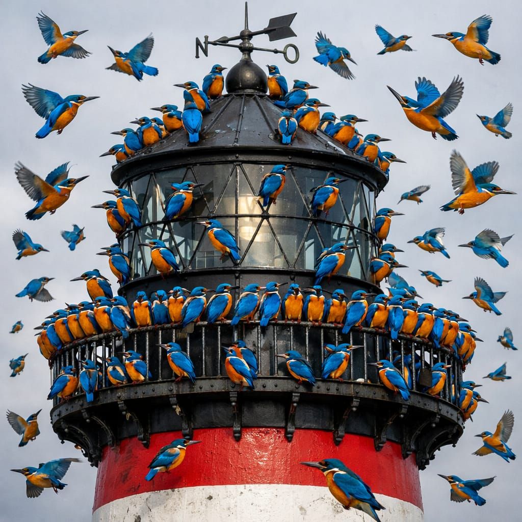 This photorealistic image shows a classic lighthouse completely covered in common kingfishers. Dozens perch on railings and roofs, while many more fill the air in flight.