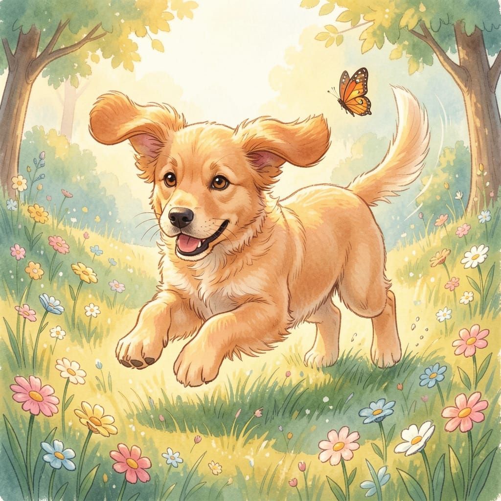 This image shows a playful Golden Retriever puppy leaping through a sunny wildflower meadow. Rendered in a whimsical illustration style with warm colors, it captures pure, energetic joy.