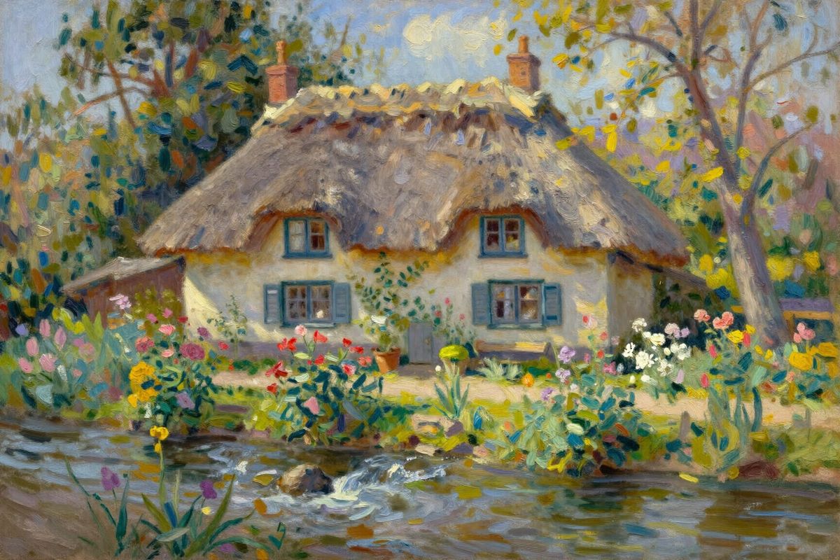 This image shows a charming cottage with a thatched roof beside a brook, set in a colorful garden. Rendered in an expressive oil painting style, it emphasizes light and color with visible brushstrokes.