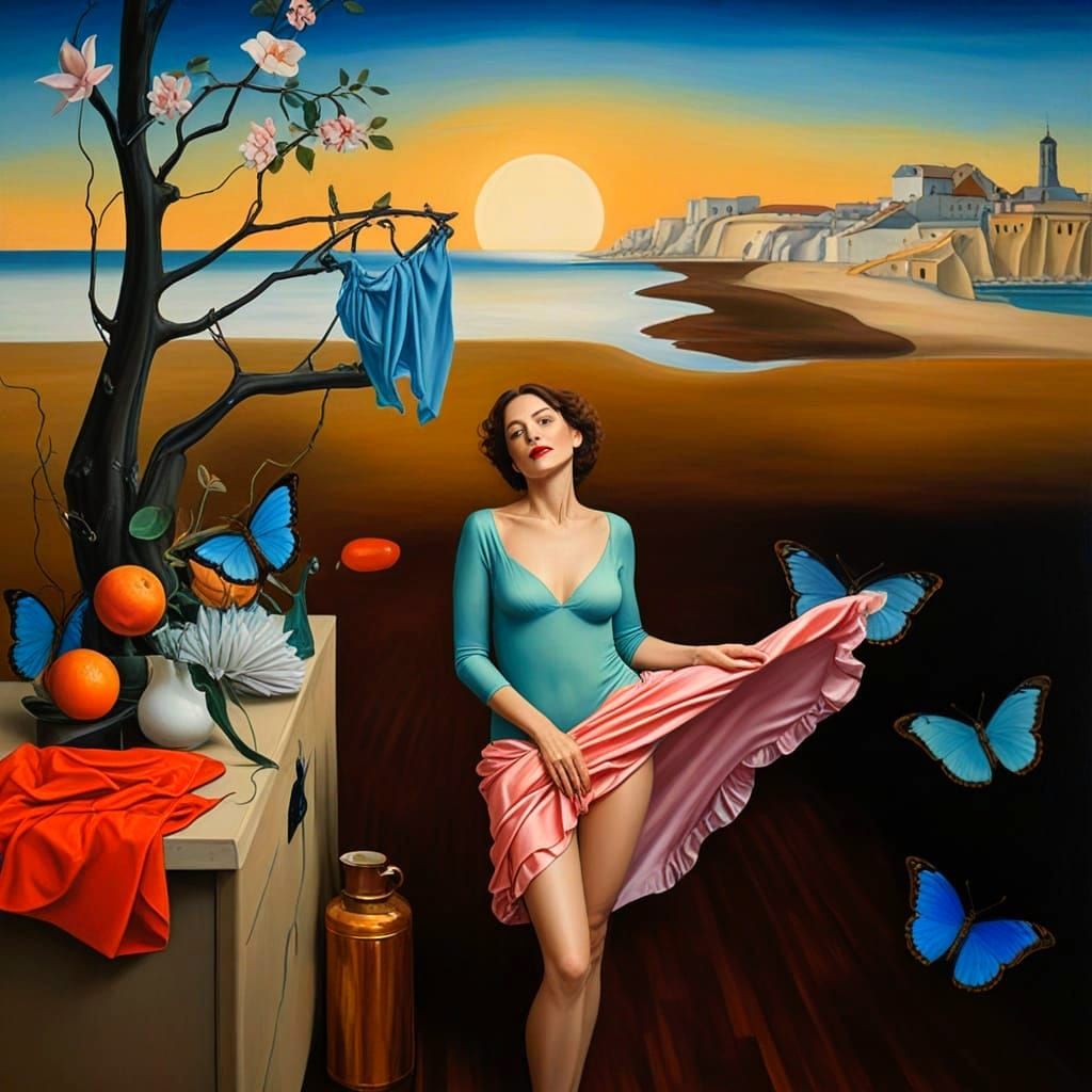 highly expressive photographic full height image of ravishing 52-year-old lady, effortless confidence, amiable engaging expression, graceful natural dynamic posture, elegant extravagant attire, authentic intimate sensual feel, compelling presence, complex artistic scene background, intense vibrant colors, ...
