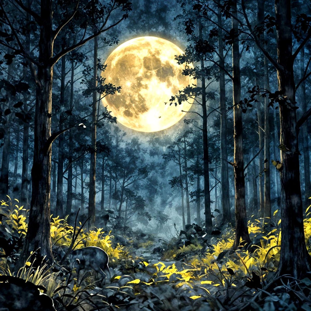This image shows a dark forest scene with a full moon, rendered in a watercolor fantasy style with soft brush strokes and high contrast lighting. Dust particles add to the mystical atmosphere.