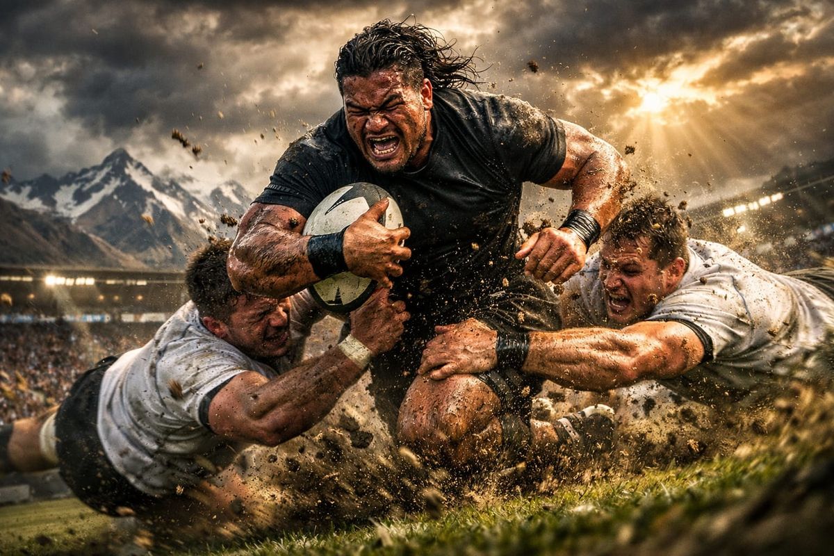 This image captures a dramatic, low-angle sports photograph of a powerful rugby tackle amidst a stormy New Zealand landscape. It showcases intense action, raw emotion, and unstoppable momentum.
