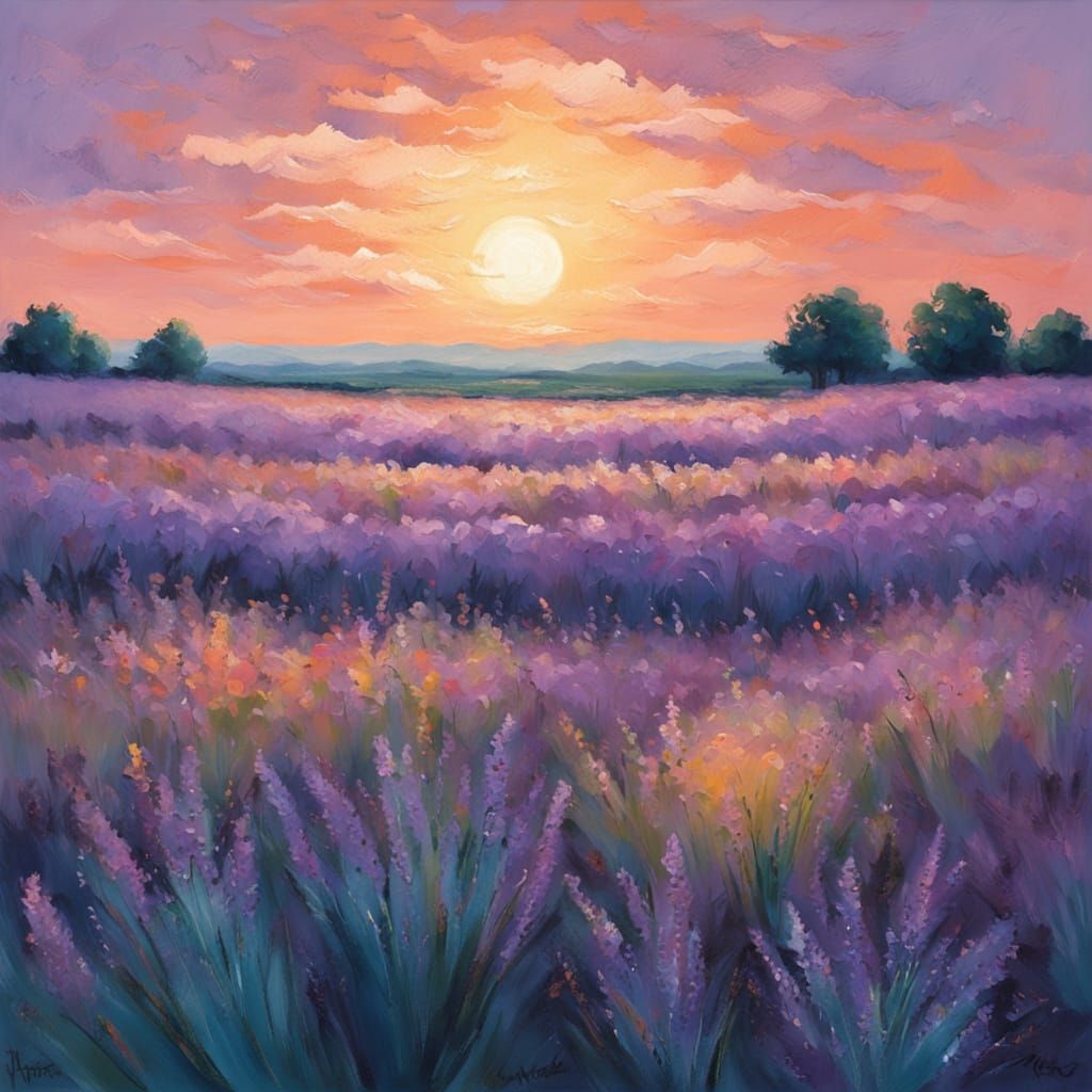 This image shows endless lavender fields in an impressionistic style. It features lush, impasto textures and a soft, diffused light from a triple sunset, creating a peaceful, vibrant atmosphere with rich detail.