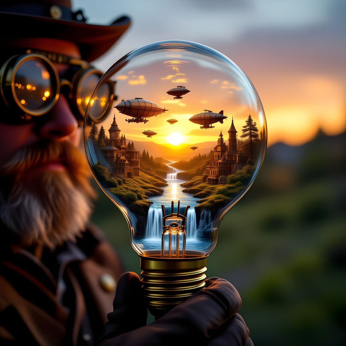 A hyperrealistic closeup of a miniature steampunk world contained within a lightbulb held by an inventor's hand, featuring a blimp and waterfalls.