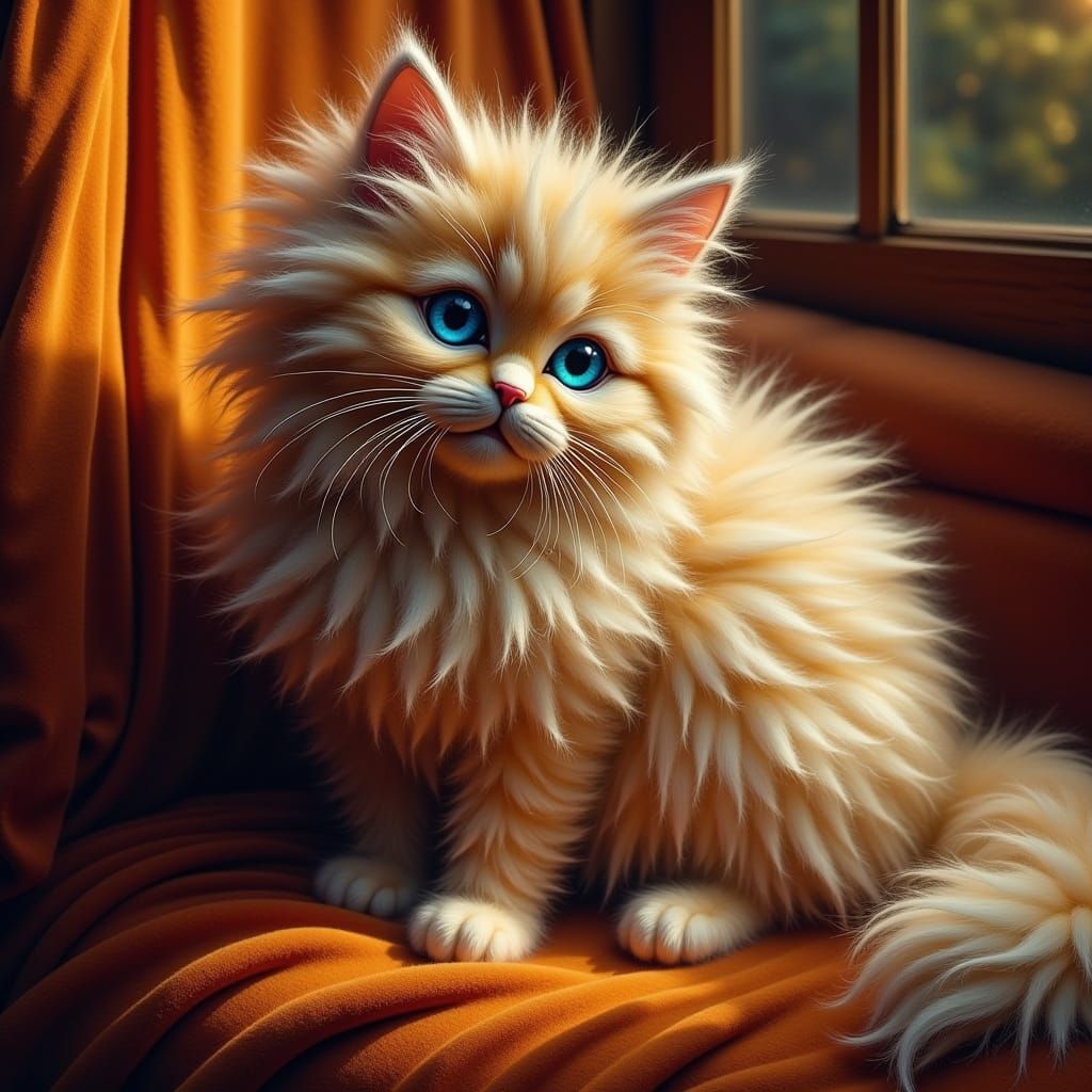 This hyperrealistic digital painting captures a fluffy Persian cat with blue eyes on a velvet cushion. Dramatic lighting highlights its regal presence in a fantasy art style.