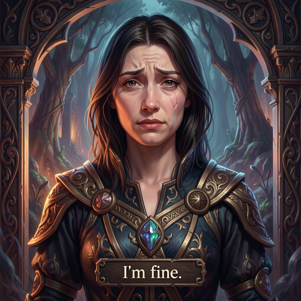 This image shows a person with a serene expression claiming they are fine, but their body language suggests hidden sorrow. Rendered as epic fantasy concept art with dramatic lighting and deep colors.