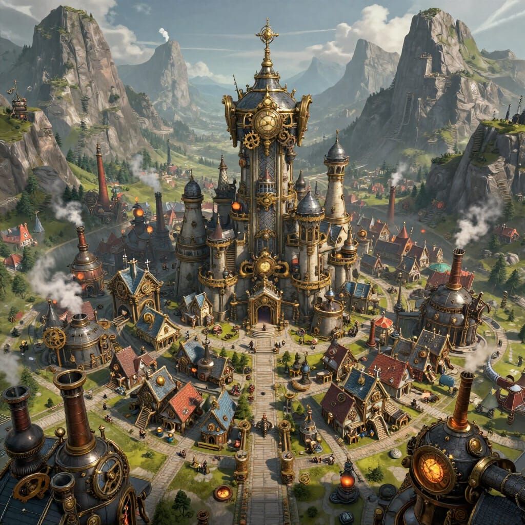 A kingdom of iron and steam built by the first inhabitants between the peaks of huge mountain ranges. These lands are inhabited by both Mountain Elves and Dwarves, who coexist in relative harmony, because, as is commonly known, dwarves rarely drink too much, so drunken brawls, arm wrestling, drinking contests, or group fights after work at the local tavern are not uncommon. But as is often the case with drunken brawlers, the next day their heads hurt too much to hold a grudge for too long, so everyone lives in peace with each other. ⛰️⚒️🏰🛠️