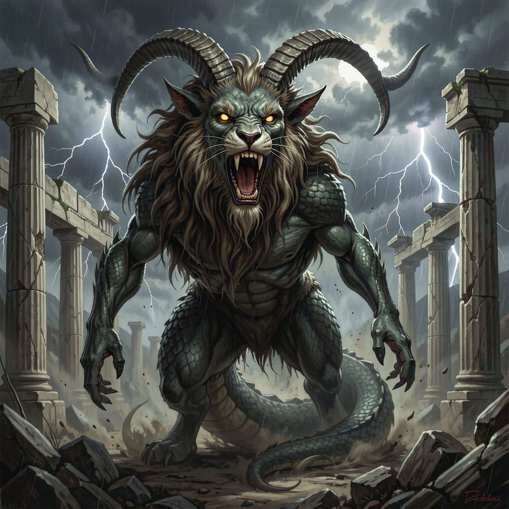 This image depicts a fearsome Chimera, a mythical beast, roaring in ancient ruins. It features dramatic lighting and a dark, ominous color scheme, evoking primal power and dread.