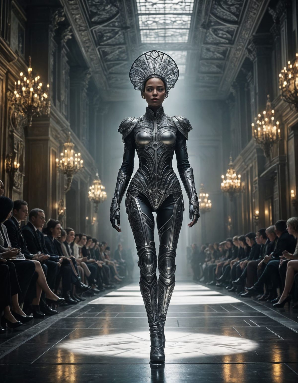 This image shows a futuristic fashion show featuring an elegantly armored figure in a patterned bodysuit and filigree veil. Cinematic lighting and film grain enhance the dramatic, atmospheric presentation.