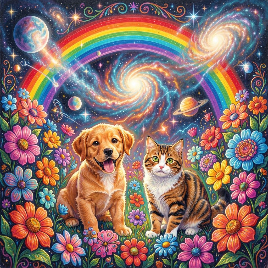 This image shows a playful puppy and a curious cat surrounded by vibrant flowers under a rainbow. The illustration features cosmic elements and intricate patterns in a psychedelic style with vivid colors.