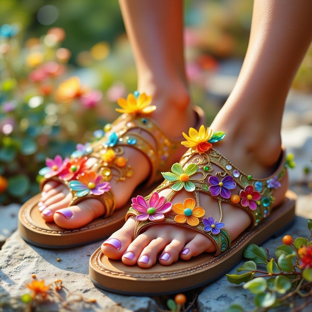 This image showcases comfortable and stylish summer sandals featuring vibrant floral embellishments. Photorealistic style with soft lighting highlights intricate details and textures.