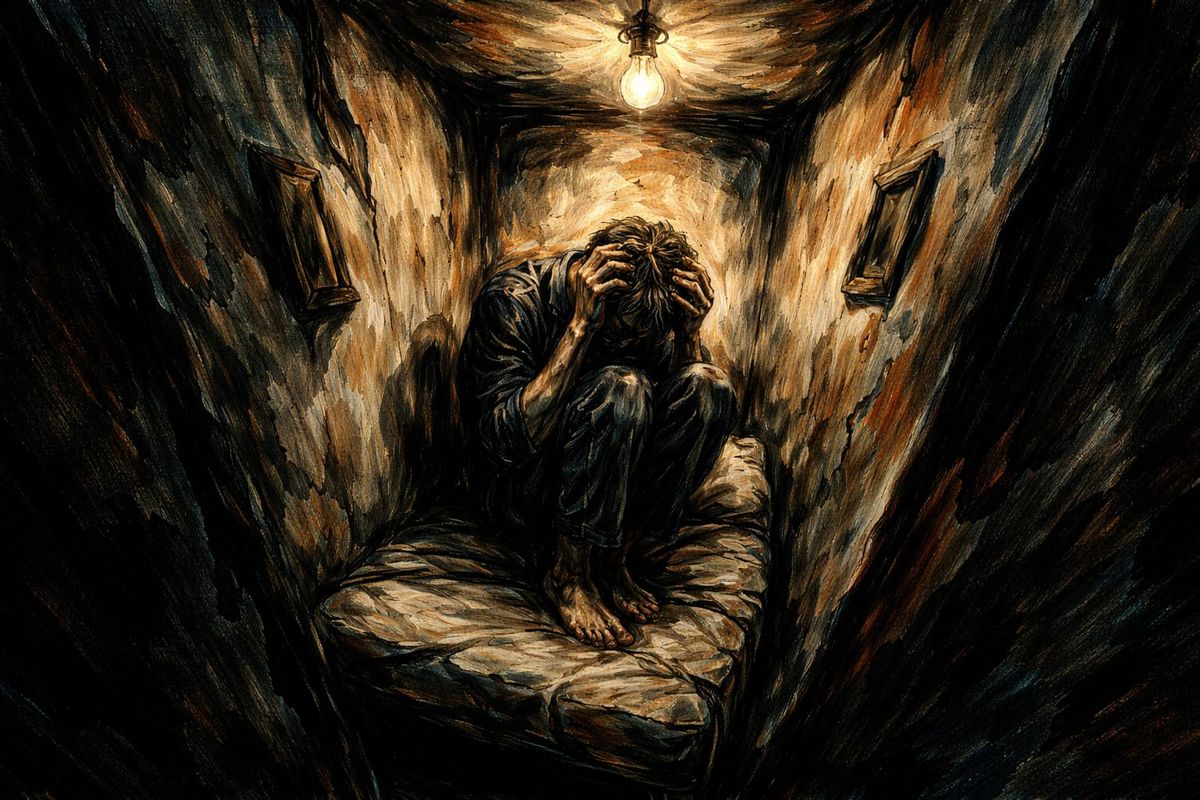 A figure sits folded on a narrow bed, hands pressed to the head as the lone bulb burns above. Rough walls close in with uneven shadows, turning the small room into a quiet chamber of weight and waiting.