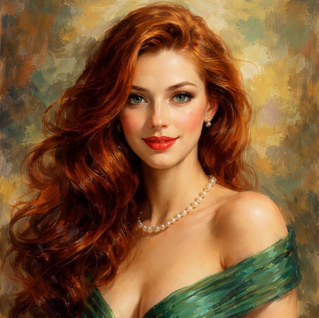 This image shows a beautiful woman with long red hair and a green off-the-shoulder gown, captured in an impressionistic oil painting style.