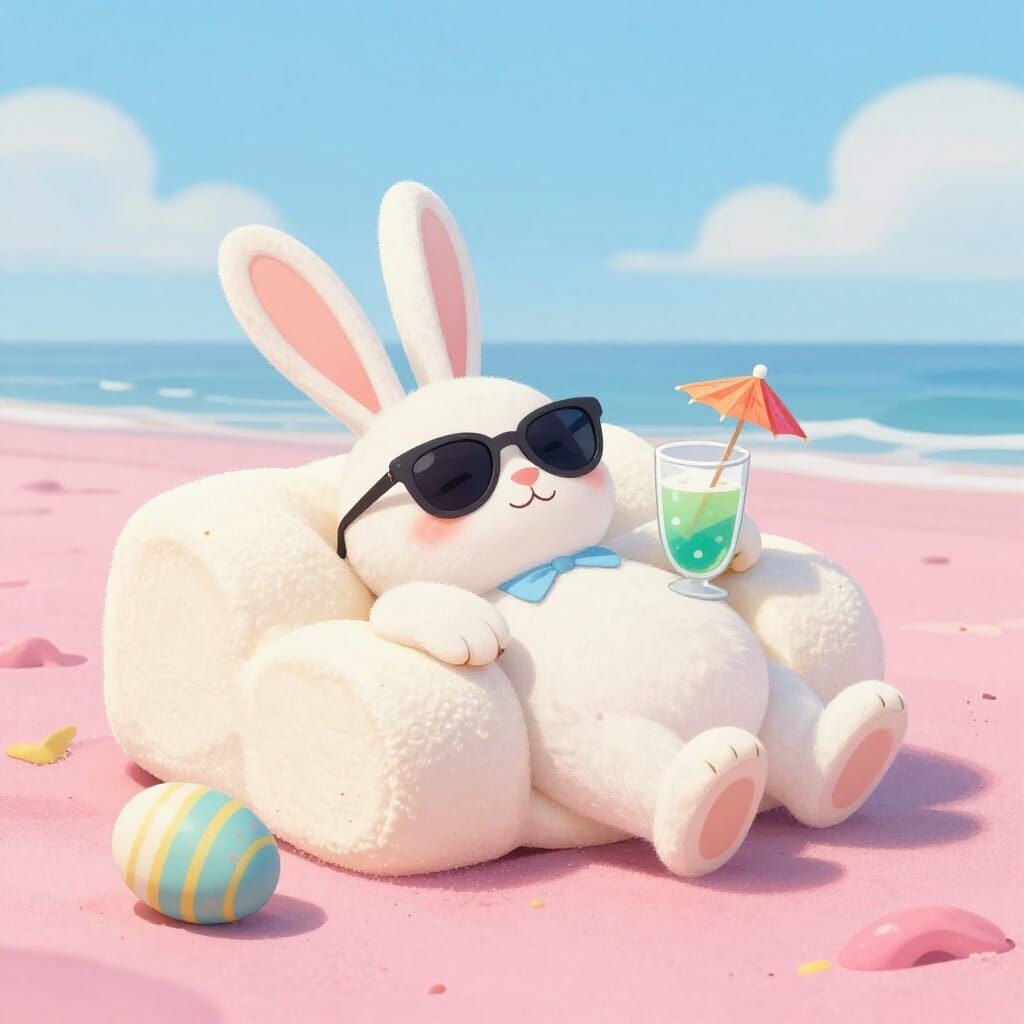 This image shows an exhausted Easter Bunny relaxing on a giant marshmallow on a pastel beach, complete with sunglasses and a tropical drink, in a vintage children's book illustration style.