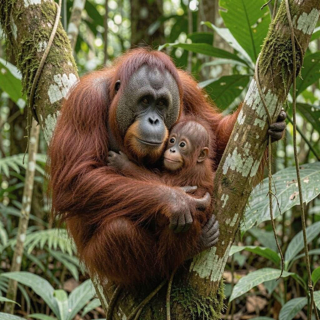 This image shows a tender moment between a mother orangutan and her baby as they embrace in a lush jungle tree. A heartwarming scene of primate family bonding.