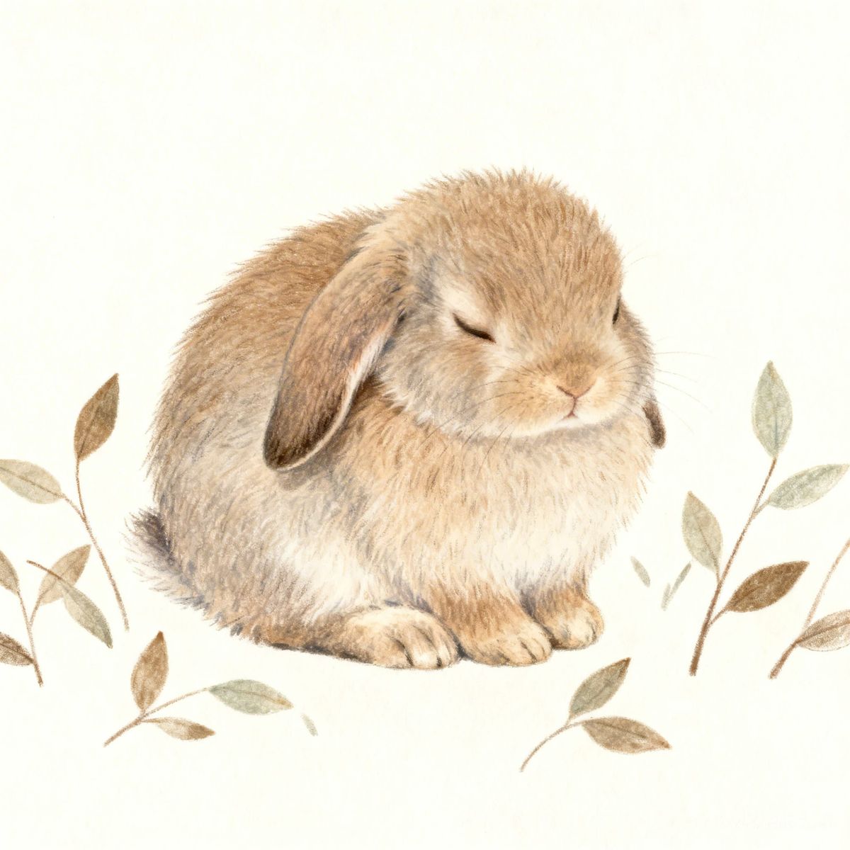 This image shows a small, fluffy rabbit resting peacefully among stylized leaves. The illustration captures a cozy, introspective mood with soft, earthy colors, inspired by gentle artistic styles.