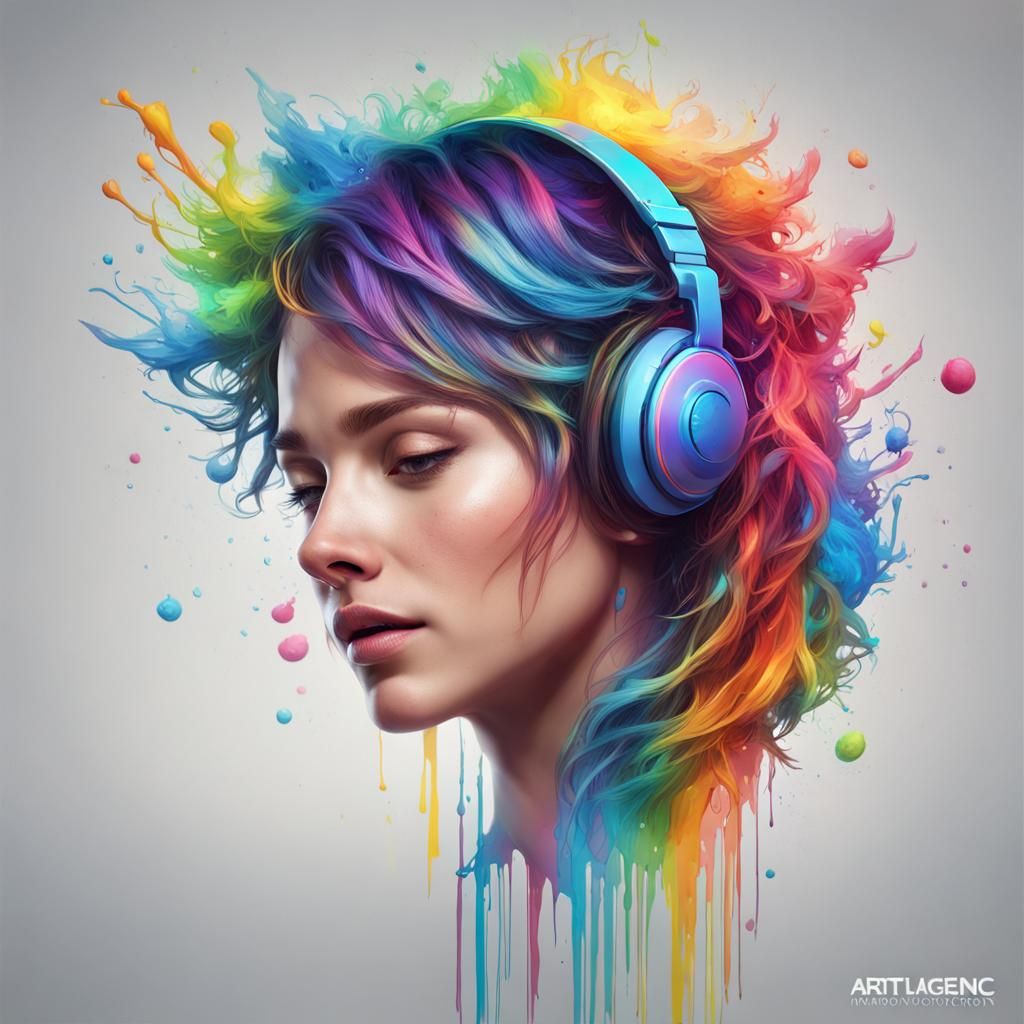 A vibrant image of a music note splashed with rainbow colors. The portrait is highly detailed with dynamic lighting and triadic colors, resembling splash art.
