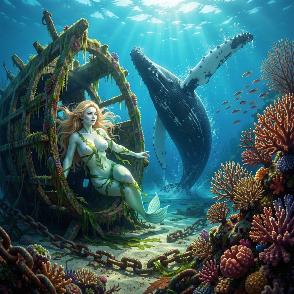 Deep under the ocean a ship reck is seen off to the left side with algae growing on is. A school of fish swim past to the right. In side the ship reck a beautiful pale skined mermaid with long blonde floating behind her and seaweed covering her chest. Her skin is also a very pale light blueish green. ...