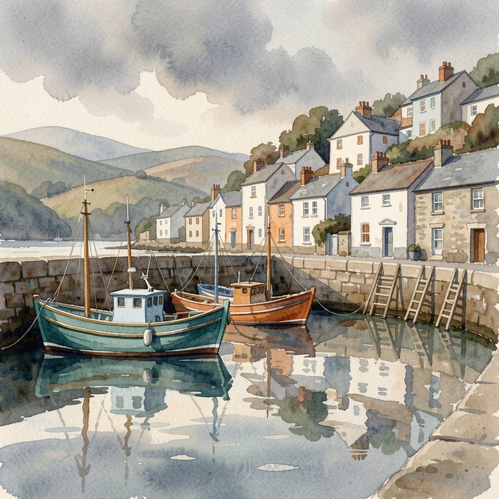 This image captures a tranquil harbor with fishing boats docked by a stone quay, rendered in a painterly, watercolor style. The scene features a picturesque coastal village under an overcast sky, emphasizing reflections and atmospheric perspective.