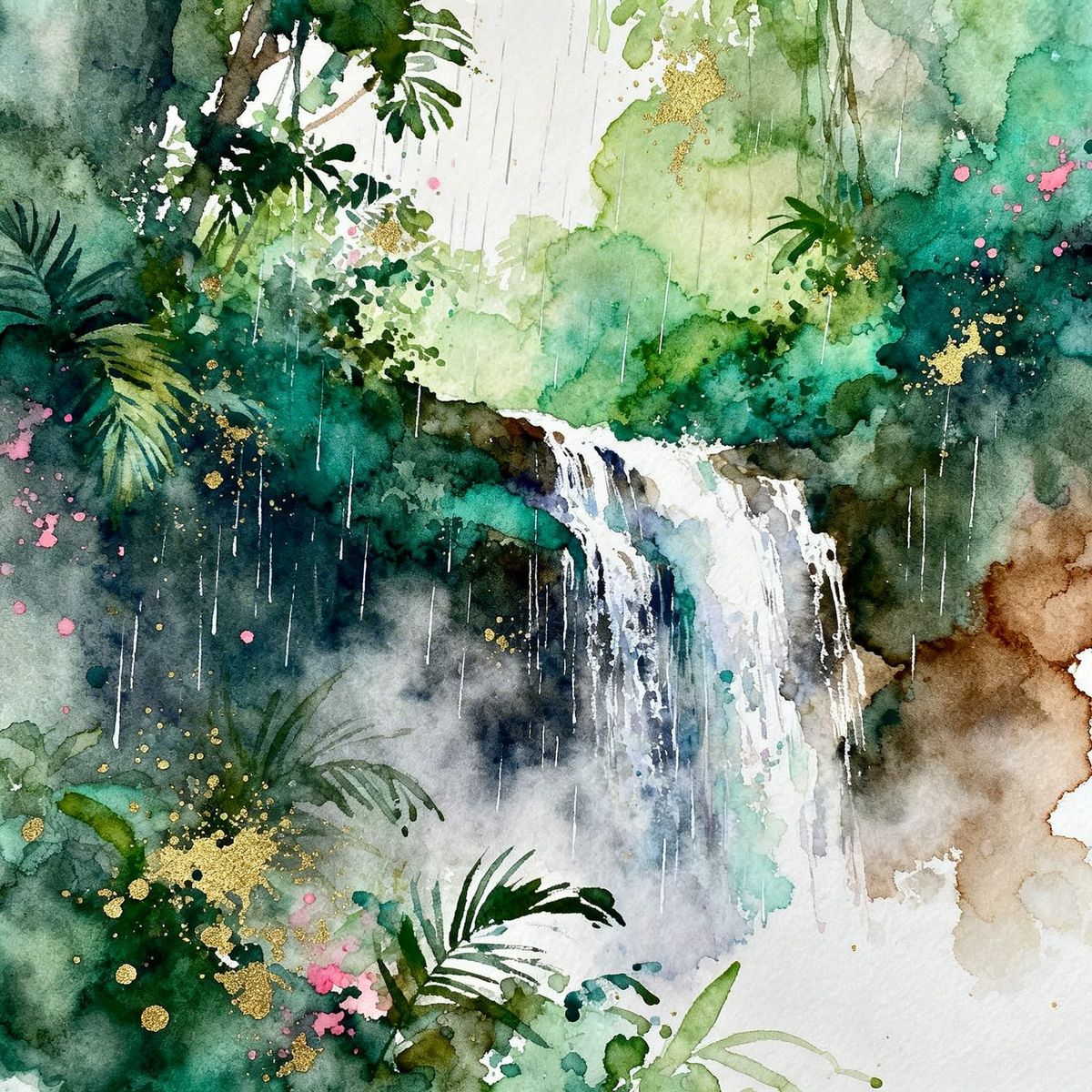 This image showcases a lush jungle waterfall rendered with dynamic watercolor and alcohol ink splatter techniques, creating a vibrant and energetic landscape.
