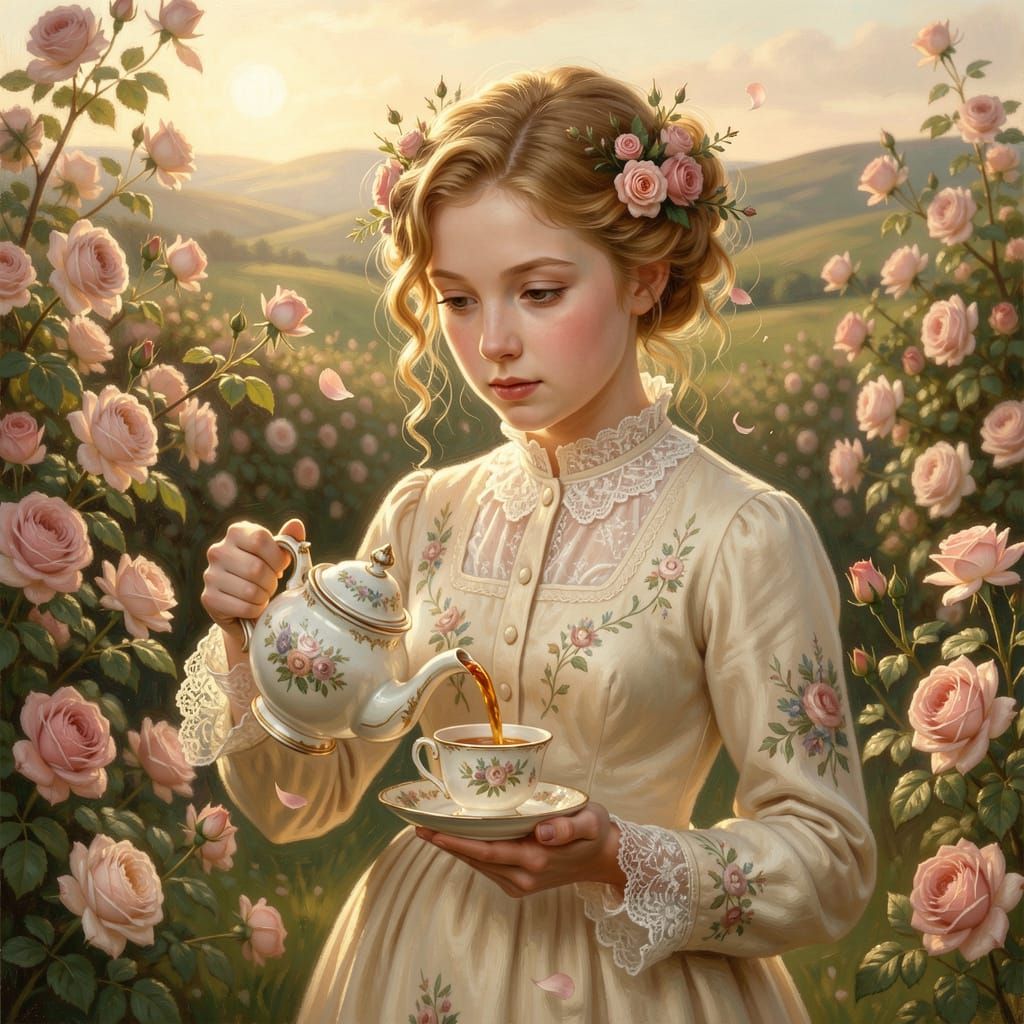 This oil painting shows a young woman pouring tea in a lush garden at sunset. Realistic details and soft focus create a museum-quality, pictorial realism.