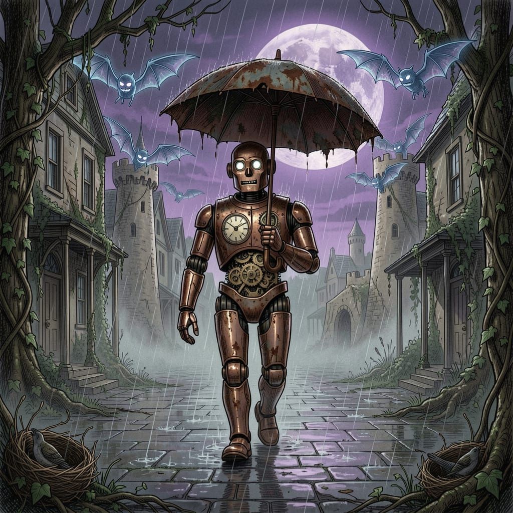 This image depicts an antique copper robot in a rain-slicked, overgrown town square under a purple moonrise. Rendered in a faded technicolor drawing style with fine linework and deep shadows.