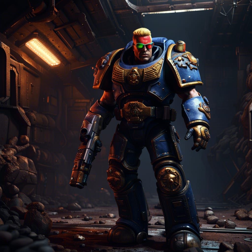 A detailed matte painting of Duke Nukem reimagined as a Space Marine. The image features deep colors, intricate details, and complementary color schemes, rendered as fantasy concept art in 8k resolution.