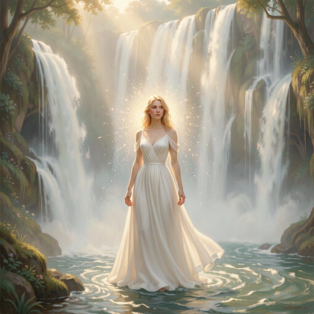 This image shows a serene blonde woman in a white dress beneath a waterfall at sunrise. Captured in a romantic, painterly style with soft lighting and a dreamy palette.