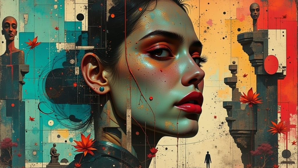 A hyperdetailed splash art portrait featuring a person against vast modern architecture with a stone sculpture. Dynamic lighting and triadic colors create a striking visual.
