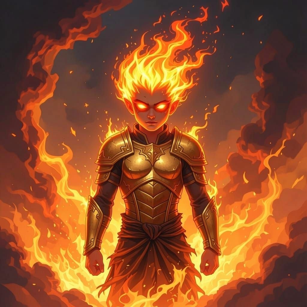 This image depicts a young male fire spirit, emanating heat and energy. The visual focuses on the character's fiery essence and youthful appearance.