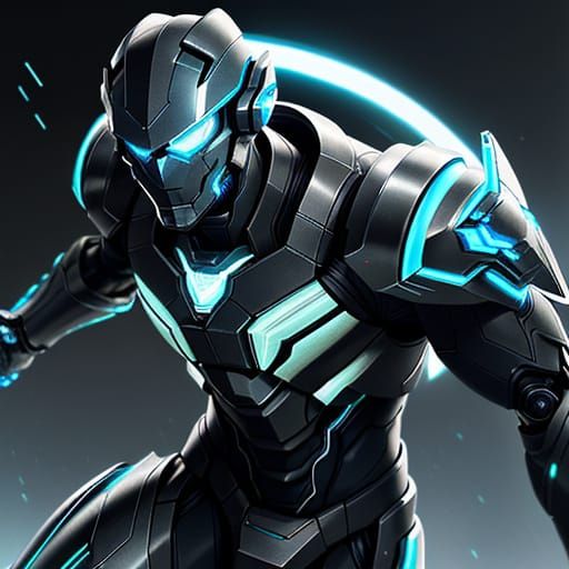 This image showcases a futuristic, humanoid figure clad in sleek, high-tech biomechanical armor, blending metallic and organic textures in a vibrant, electric blue and silver color scheme, with glowing accents and dynamic motion effects emphasizing speed and agility.